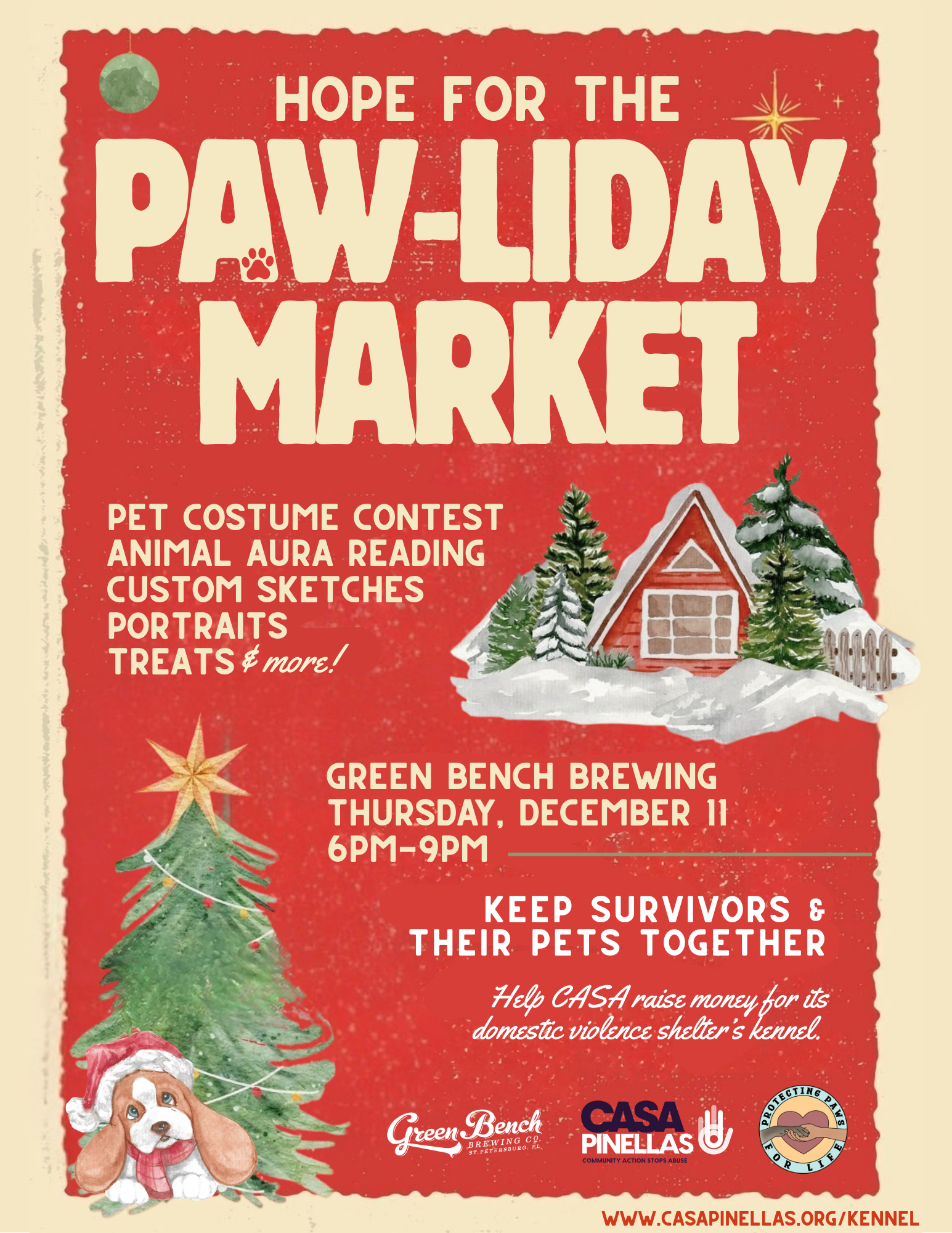 Join us Thursday, December 11, for holiday fun! Support local vendors, spread the holiday spirit, and help CASA raise money to renovate its kennel. Get a custom pet painting, participate in raffles, get a professional photo taken, dress your pet up for the costume contest, enjoy seasonal treats, and more!