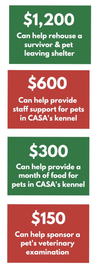 Now, you have the chance to give that same hope to other survivors. a generous donor is matching all end-of-year donations for our on-site kennel and survivor pet services, ensuring no one has to choose between their safety and their pets. Everyone deserves to feel safe at home, including our pets.